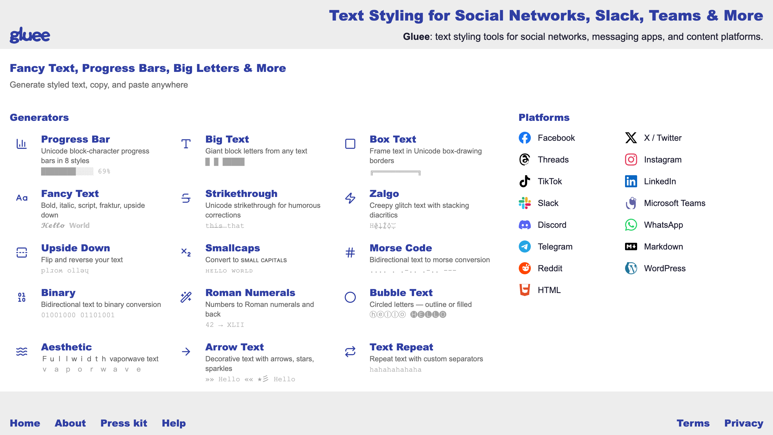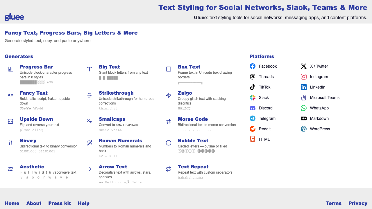 Gluee: text styling tools for social networks, messaging apps, and content platforms.
